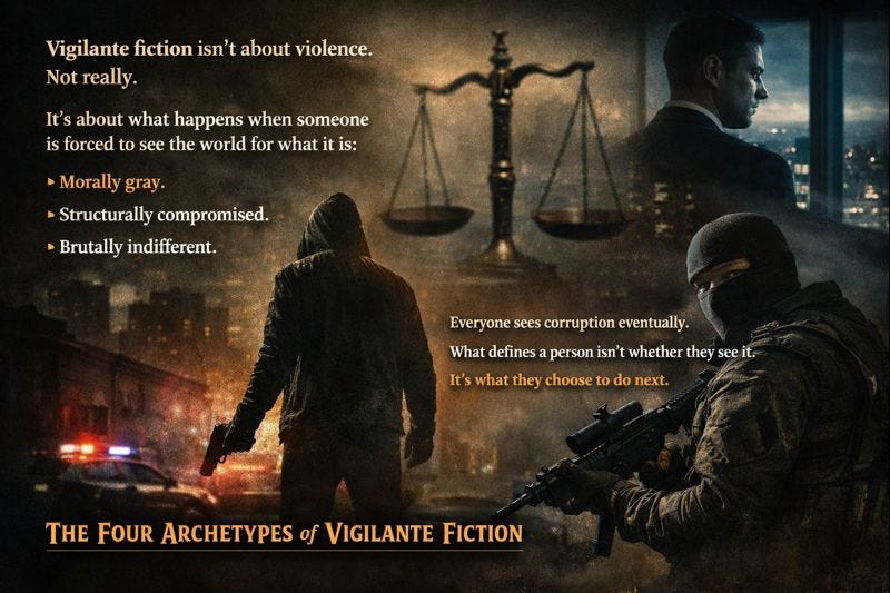 Vigilante fiction is about what happens when someone is forced to see the world for what it is: morally gray, structurally compromised, and brutally indifferent.